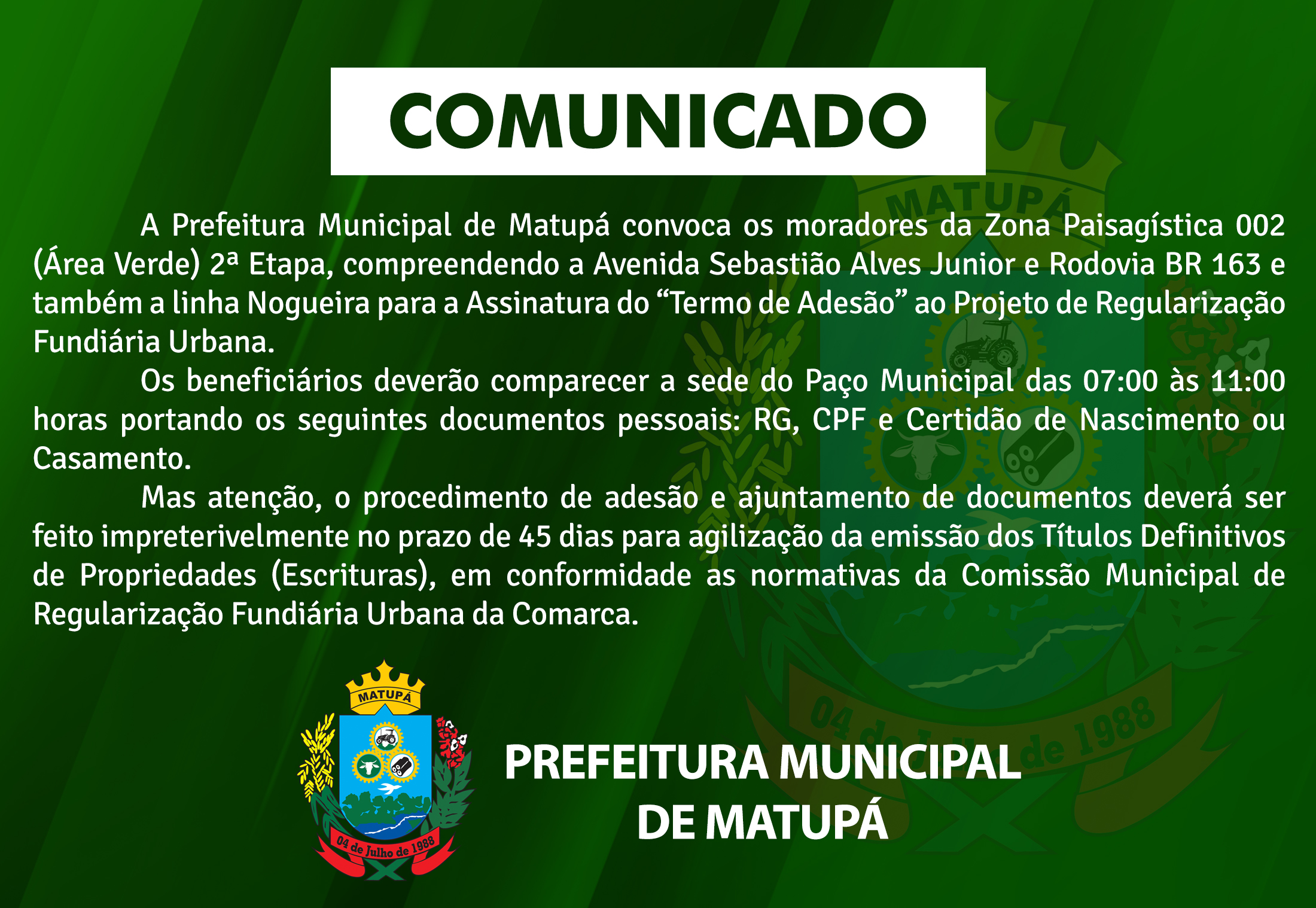 A Prefeitura Municipal de Matupá convoca os moradores da Zona Paisagística 002 (Área Verde), compreendendo a Avenida Sebastião Alves Junior e Rodovia BR 163 e também os moradores da linha Nogueira para a Assinatura do “Termo de Adesão” ao Projeto de Regularização Fundiária Urbana, 2ª Etapa.