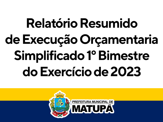A Prefeitura Municipal de Matupá – MT, COMUNICA que a partir da presente data, o RELATÓRIO RESUMIDO DA EXECUÇÃO ORÇAMENTÁRIO SIMPLIFICADO 1º BIMESTRE , referente ao exercício financeiro de 2023, estão à disposição para exame e apreciação dos interessados, na sede da Prefeitura Municipal de Matupá – MT, nos termos da Legislação pertinente vigente.