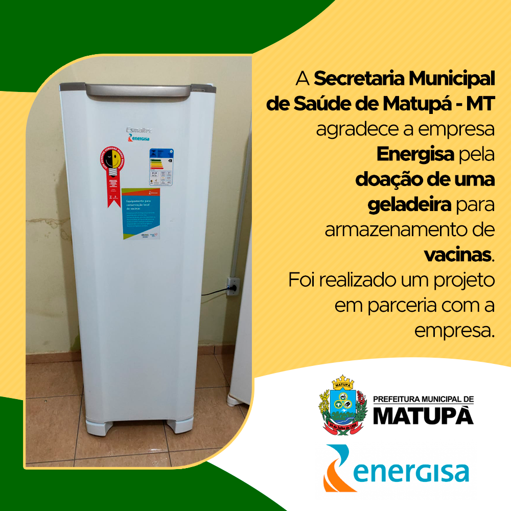 A Secretaria Municipal de Saúde de Matupá agradece a empresa Energisa pela doação de uma geladeira para armazenamento de vacinas. Foi realizado um projeto em parceria com a empresa.