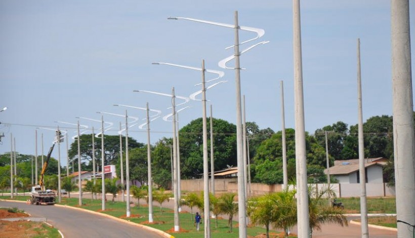 Depois dos serviços de posteamento com Super-Postes e a conclusão do sistema de tubulação e fiação elétrica, a empresa vencedora do processo licitatório está executando a instalação dos braços ornamentais e das luminárias de LED ao longo da avenida onde foram executadas em 2017 as obras de drenagem, pavimentação asfáltica, construção do canteiro central e jardinagem.