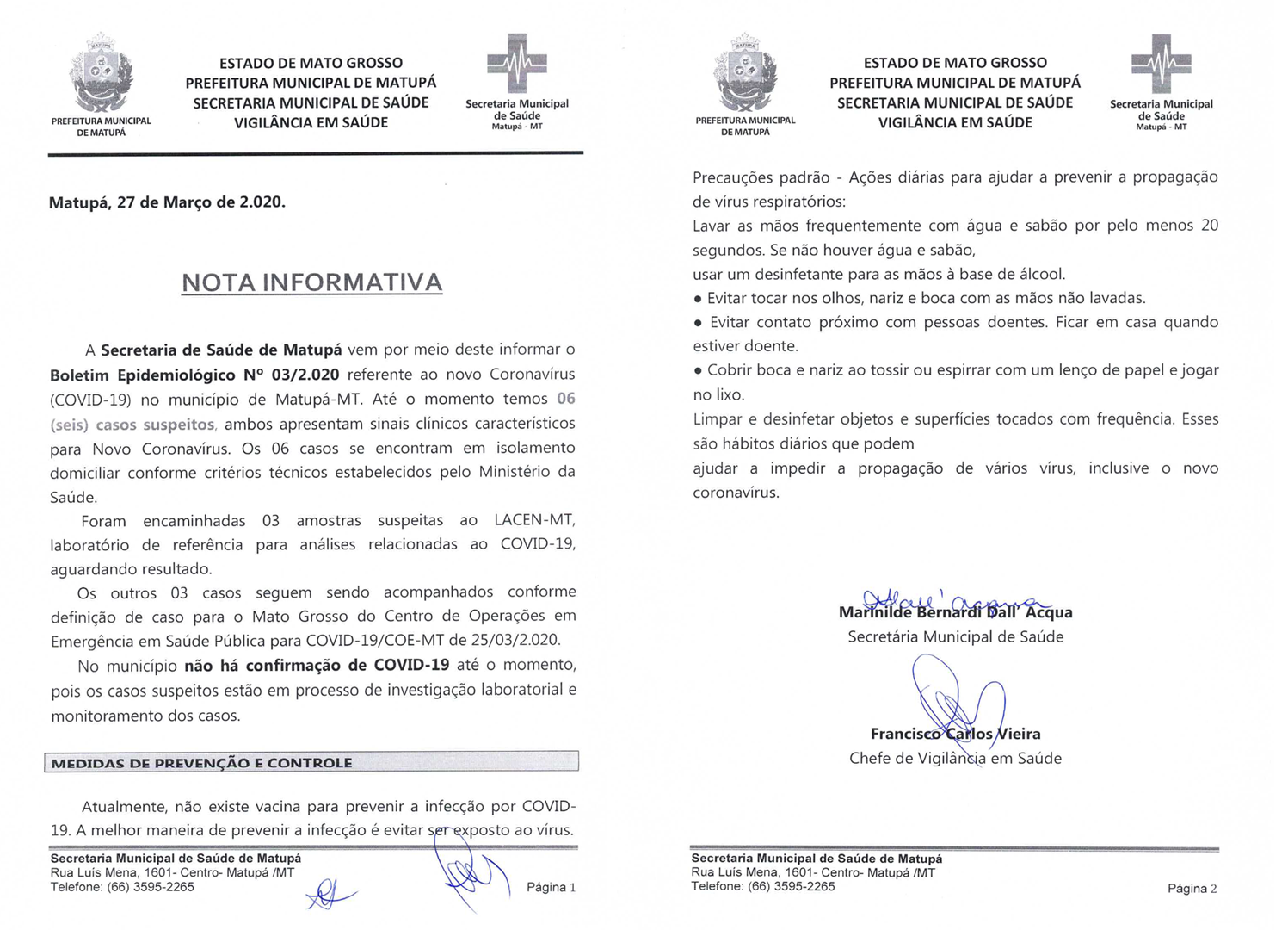 A Secretaria de Saúde de Matupá torna público a Nota Informativa - Boletim Epidemiológico Nº 03/2020 sobre o novo Coronavírus (COVID-19) no contexto municipal.