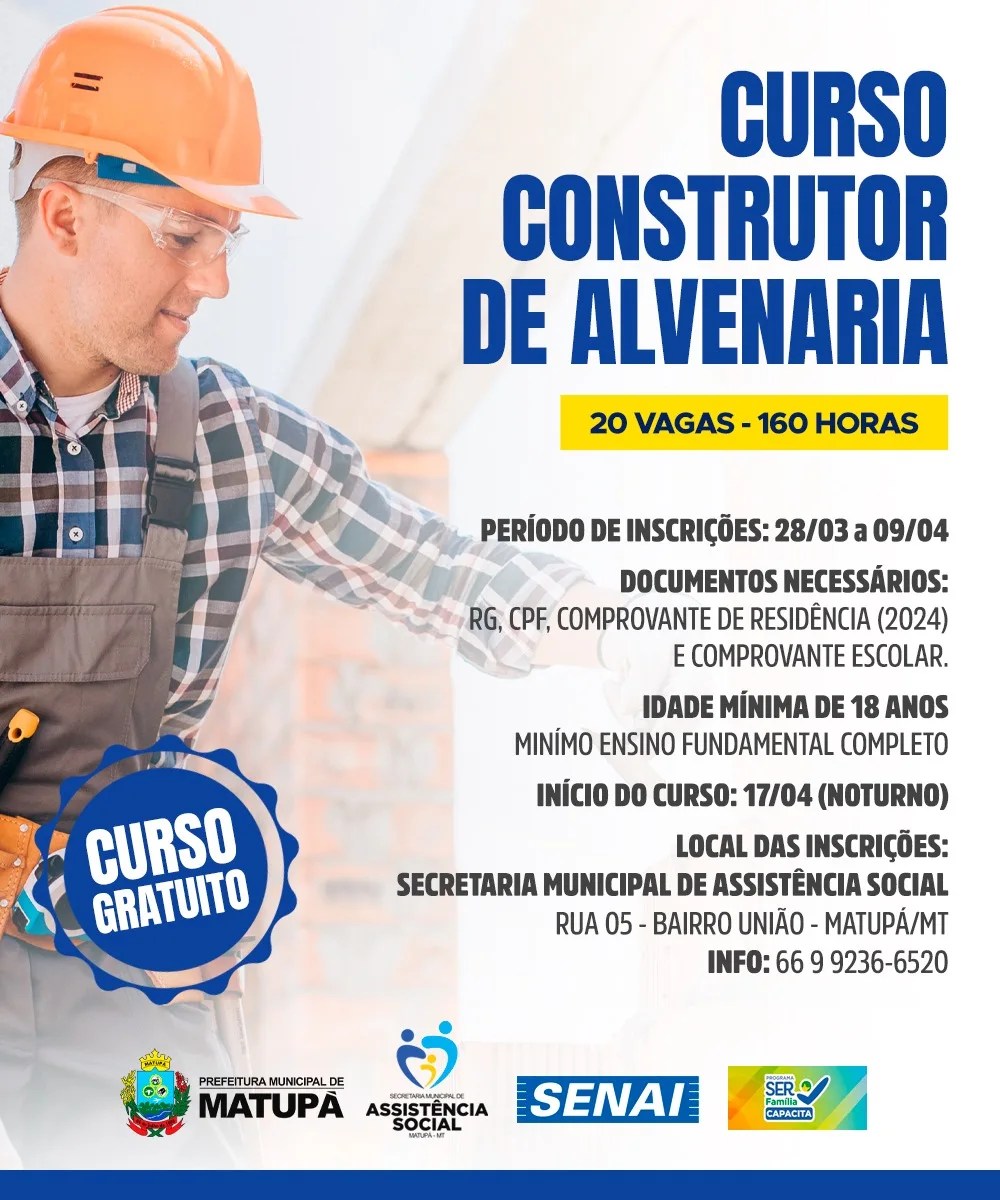 A secretaria de assistência social, por meio do programa Qualifica Matupá, está disponibilizando o curso de construtor de alvenaria, totalmente gratuito.