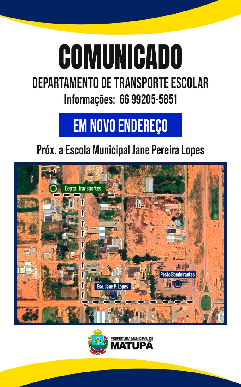 A Prefeitura Municipal de Matupá informa que o Departamento de Transporte Escolar está funcionando em novo endereço. Agora, a sede está localizada nas proximidades da Escola Municipal Jane Pereira Lopes, oferecendo mais facilidade e acessibilidade para os pais, responsáveis e estudantes que necessitam de informações ou serviços relacionados ao transporte escolar.