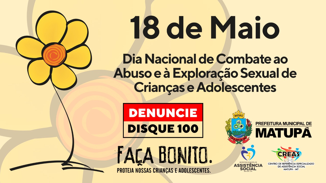 O Creas de Matupá-MT trabalha esse tema ao longo de todo o ano e que se intensifica no mês de maio com a campanha. Neste ano ao longo do mês o Creas juntamente com a Secretaria de Assistência Social e outros parceiros vem realizando campanhas informativas através de faixas orientativas, cartazes no comércio e órgãos públicos, distribuição de folders , vídeo sobre o tema, bem como estará distribuindo cartilhas com orientações de forma lúdica para crianças atendidas pelos programas sociais.