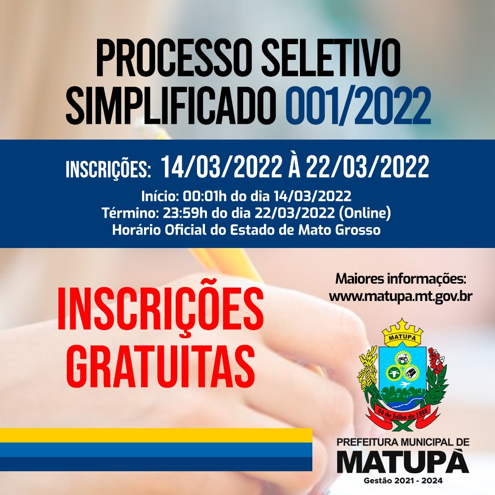 A prefeitura municipal de Matupá abriu as inscrições para o processo seletivo simplificado 001/2022, as inscrições são do dia 14/03 e vão até o dia 22/03