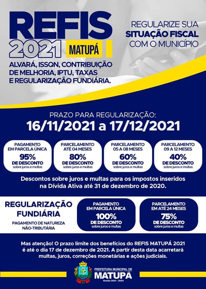 Mas atenção, o prazo limite dos benefícios do REFIS Matupá 2021 é até o dia 17 de dezembro de 2021, ou seja, amanhã é o último dia, a partir desta data acarretará multas, juros, correções monetárias e ações judiciais.