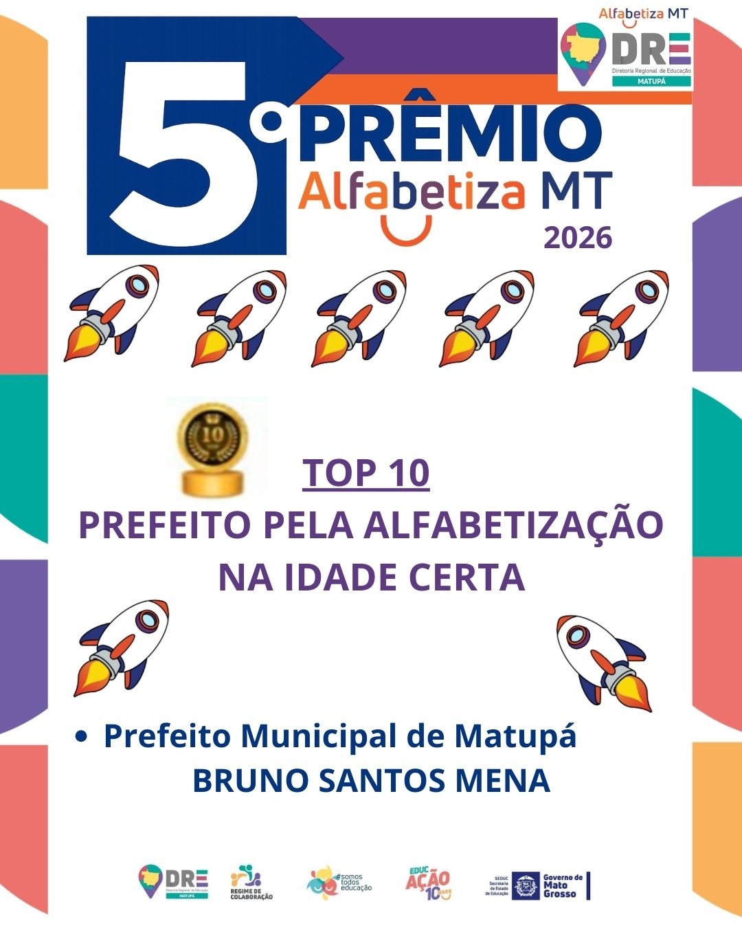 O município de Matupá conquistou um importante reconhecimento na educação ao figurar entre os 10 melhores municípios de Mato Grosso no Prêmio Alfabetiza MT 2026, alcançando a 7ª colocação no ranking estadual no indicador IDEMT-Alfa. O resultado reflete o trabalho conjunto da gestão municipal, professores, alunos e equipes escolares que se dedicam diariamente para garantir a alfabetização na idade certa. O reconhecimento também destaca escolas premiadas, além do estudante Pedro Kaefer Korbes Weiss, da Escola Municipal Cecília Meireles, e da professora alfabetizadora Meire Cherle Correia Vitorino, exemplos do compromisso com a qualidade do ensino no município.