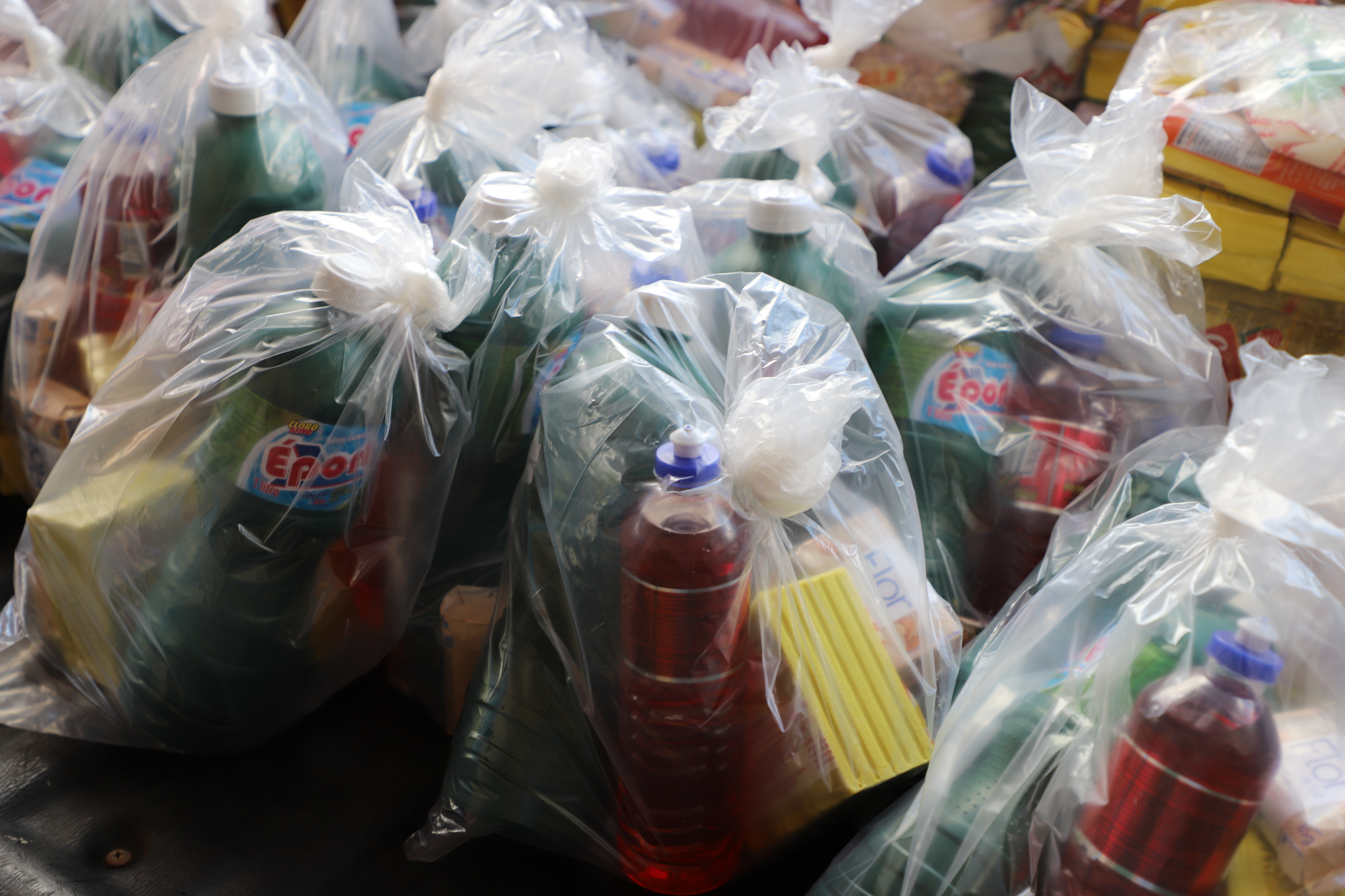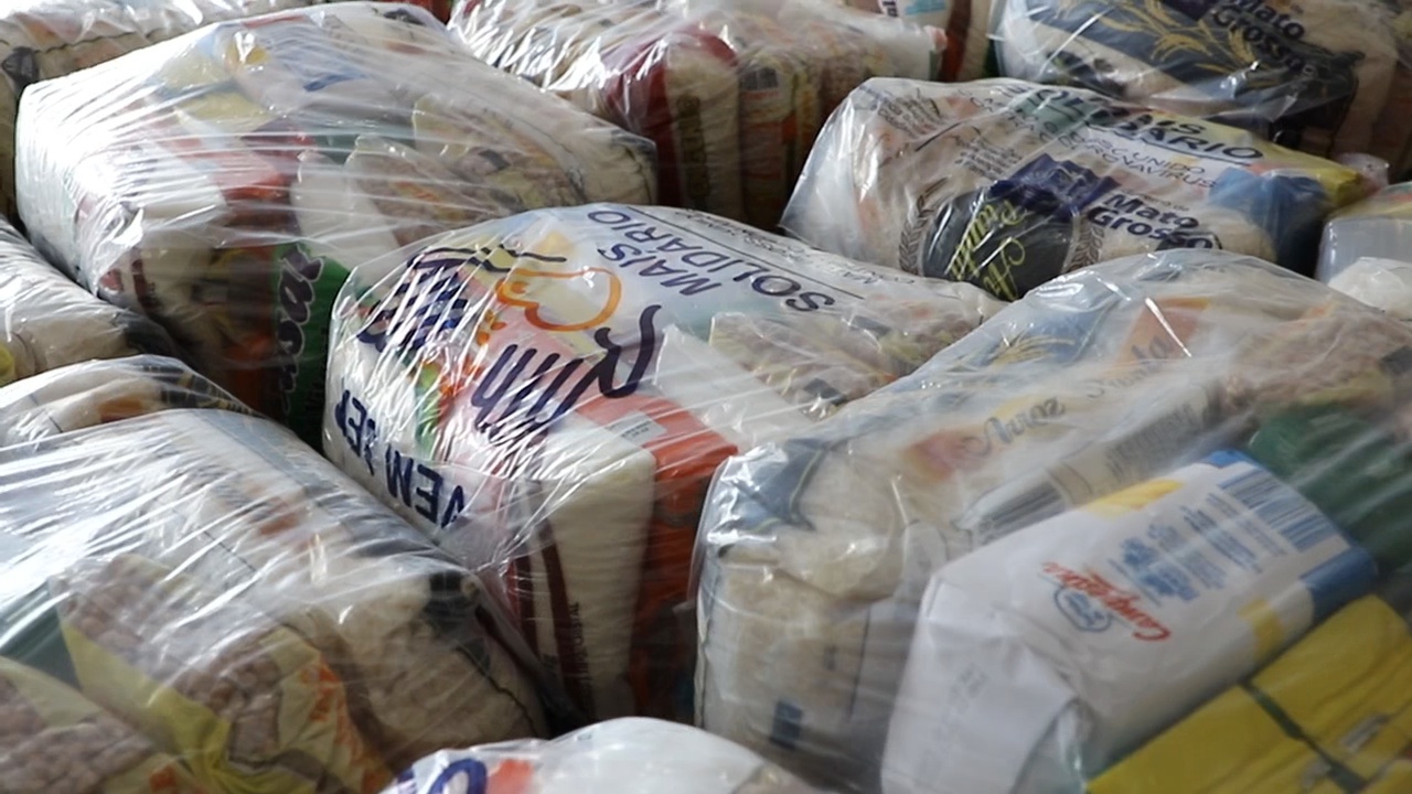 As cestas básicas doadas contém arroz, feijão, macarrão, óleo, sal, açúcar, café, farinha de trigo, sardinha, extrato de tomate, além de materiais de limpeza e de higiene pessoal.