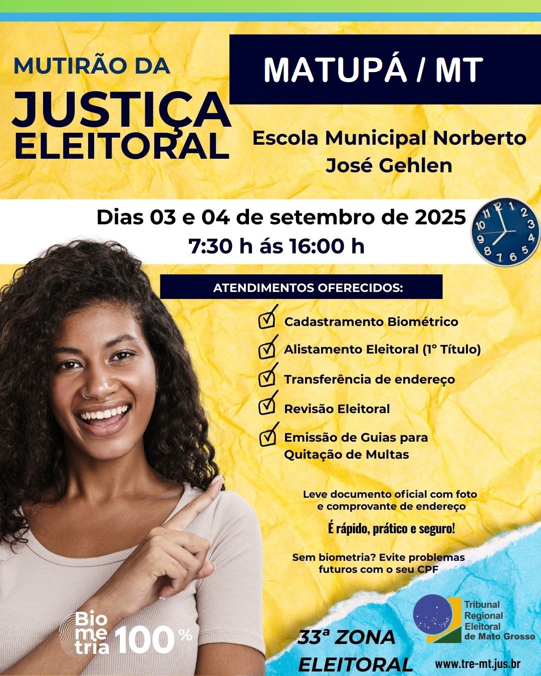 A Justiça Eleitoral promove, nos dias 03 e 04 de setembro de 2025, um grande mutirão de atendimentos em Matupá, na Escola Municipal Norberto José Gehlen. O horário de funcionamento será das 7h30 às 16h, oferecendo serviços como cadastramento biométrico, alistamento eleitoral (1º título), transferência de endereço, revisão eleitoral e emissão de guias para quitação de multas.