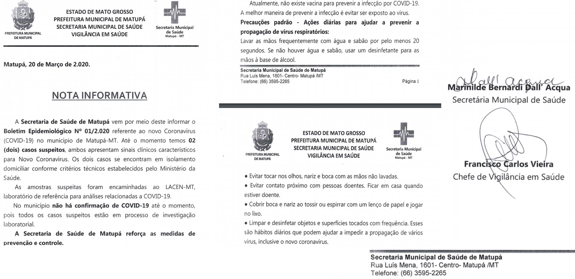 | Nota Informativa - Boletim Epidemiológico | Acesse a Nota Informativa - Boletim Epidemiológico em anexo (PDF). ATENÇÃO! A Secretaria de Saúde de Matupá torna público a Nota Informativa - Boletim Epidemiológico Nº 01/2020 sobre o novo Coronavírus (COVID-19) no contexto municipal. Leia a nota emitida nesta sexta-feira, dia 20 de março de 2020. |