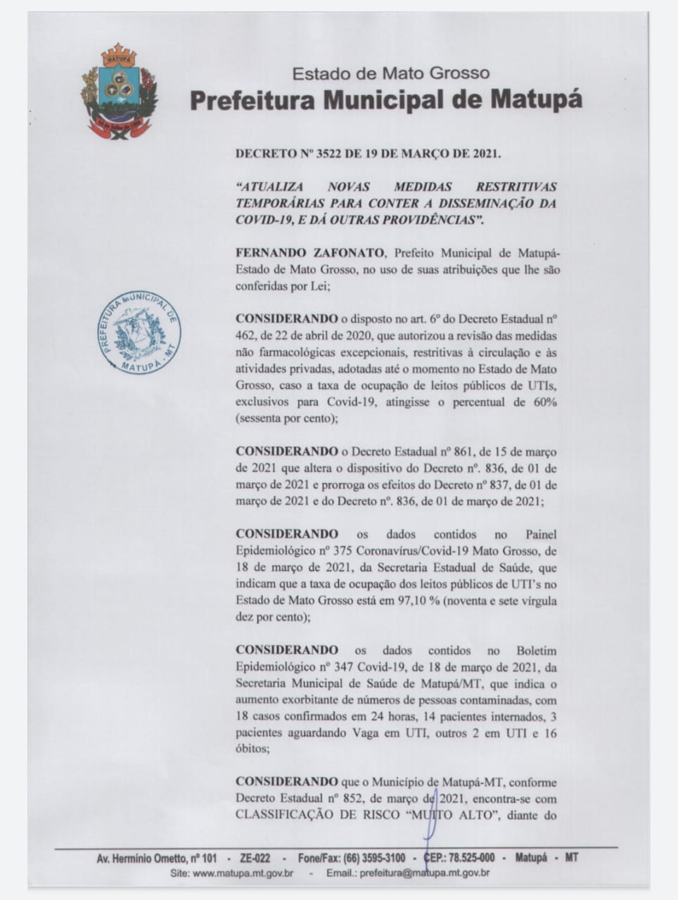 Devido ao grande aumento de casos em matupá o executivo municipal fernando Zafonato anunciou hoje mais duas alterações no decreto n°, onde fica proibido a partir de hoje (19/03) o consumo de bebidas alcoólicas em todo estabelecimento comercial de Matupá, essa situação não havia sido abordado no decreto anterior onde foi proibido apenas o consumo em lugares de circulação pública, a partir de agora o decreto proíbe o consumo de bebidas com teor alcoólico em todos os estabelecimentos comerciais.