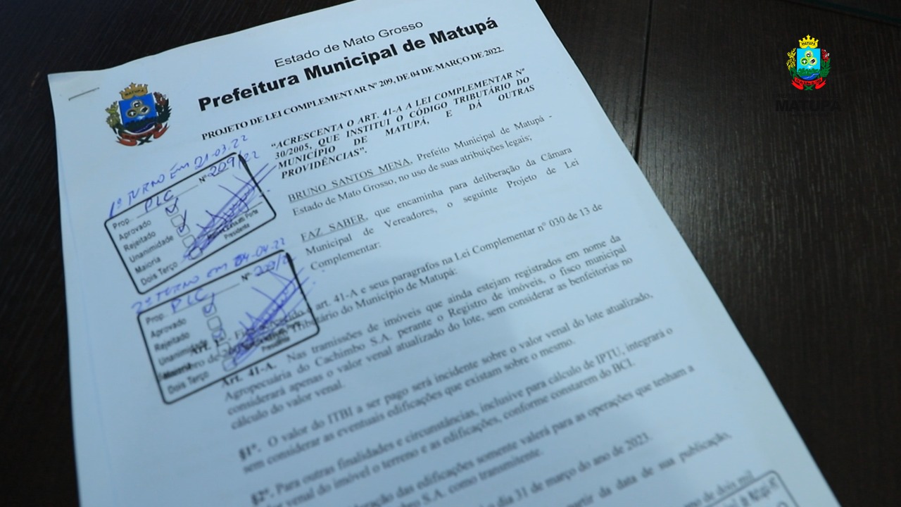 Através desta lei feita pelo Executivo Municipal Bruno Mena os valores antes cobrados vão ter uma significativa diminuição, segundo o prefeito a ideia é incentivar a sociedade a regularizar seus imóveis e trazer segurança para a sociedade, “Agora ficou mais fácil e mais rentável para a pessoa que quer transferir da Agropecuária Cachimbo, antiga colonizadora Cachimbo, para seu nome, é um programa de incentivo para documentação de imóveis de Matupá” ressalto Prefeito Bruno.