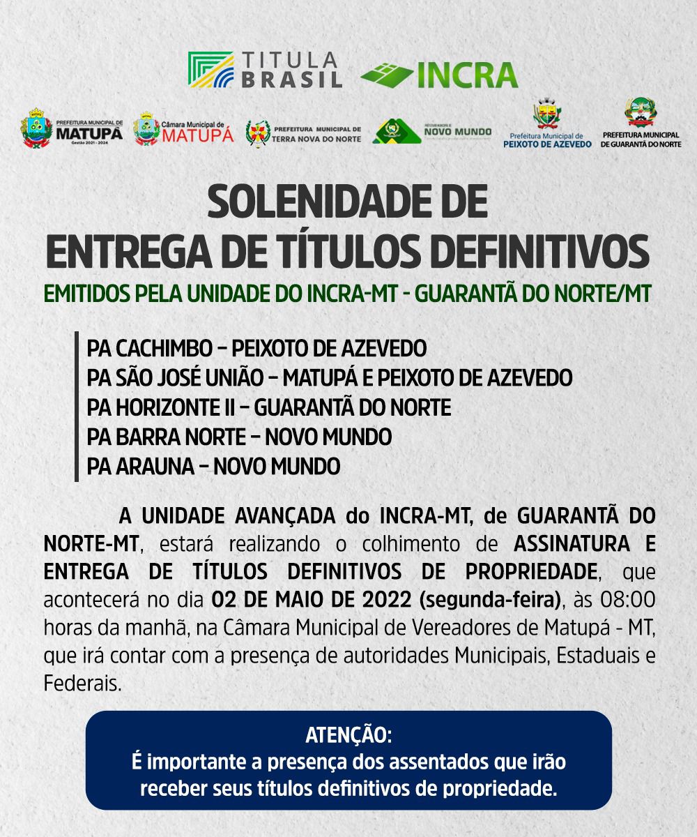 A Prefeitura Municipal de Matupá, através do Prefeito Bruno Mena, irá realizar no próximo dia 02 de maio de 2022, a entrega de Títulos definitivos de propriedade, para o Assentamento São José União de Matupá.