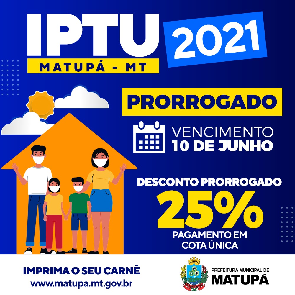 Fique atento, a prorrogação não é apenas para o vencimento da primeira parcela, mas também para a cota única, assim aqueles que querem fazer o pagamento da totalidade do IPTU, tem até o dia 10 de junho de 2021 para fazer a quitação com o desconto de 25%.