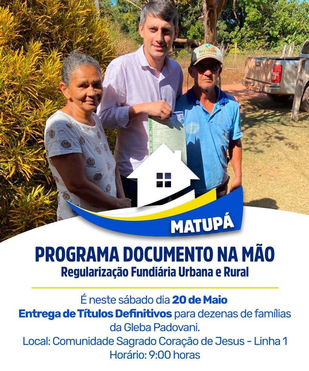No próximo sábado dia 20 de maio será realizada mais uma etapa do Programa Documento na Mão desenvolvido pela Prefeitura Municipal de Matupá. Dezenas de famílias da Gleba Padovani estão sendo convocadas para receberem seus Títulos Definitivos de Propriedade. O evento acontecerá na Comunidade Sagrado Coração de Jesus na Linha 01 com a presença do Prefeito Bruno Mena, Vereadores, Secretários e representantes do INCRA-MT.