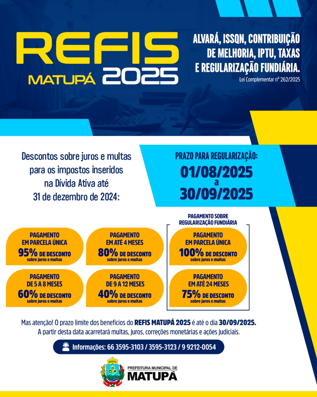 A Prefeitura Municipal de Matupá lançou o Programa REFIS 2025, oferecendo condições especiais para contribuintes regularizarem débitos de Alvará, ISSQN, Contribuição de Melhoria, IPTU, taxas e regularização fundiária. O programa garante até 95% de desconto sobre juros e multas para pagamentos em parcela única e opções facilitadas em até 12 meses, válidas para impostos inscritos na Dívida Ativa até 31 de dezembro de 2024.