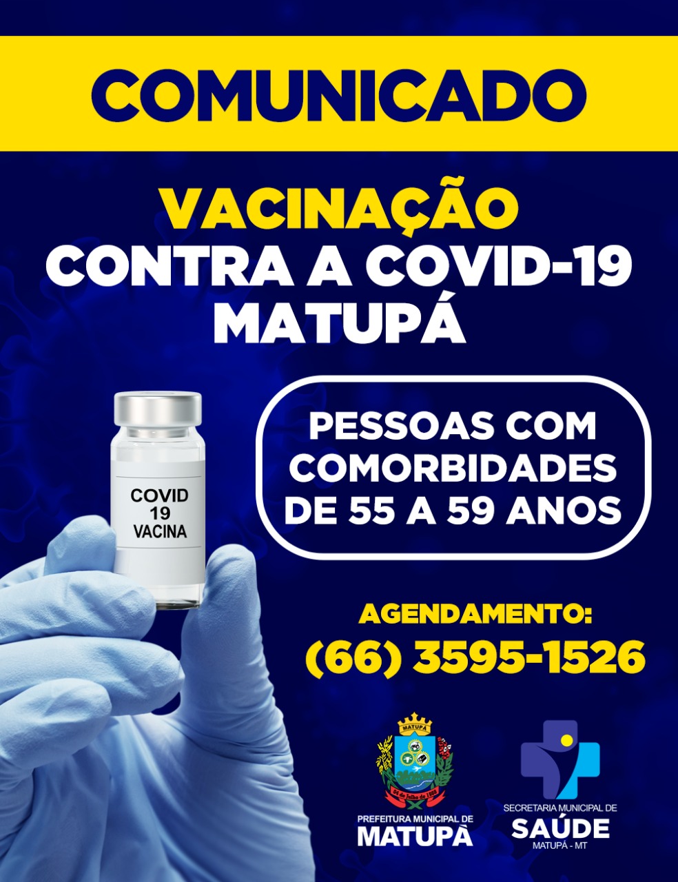 As pessoas que se enquadram na lista acima devem procurar a Secretaria Municipal de Saúde ou ligar no telefone (66) 3595 1526 e fazer o agendamento para as datas disponíveis.