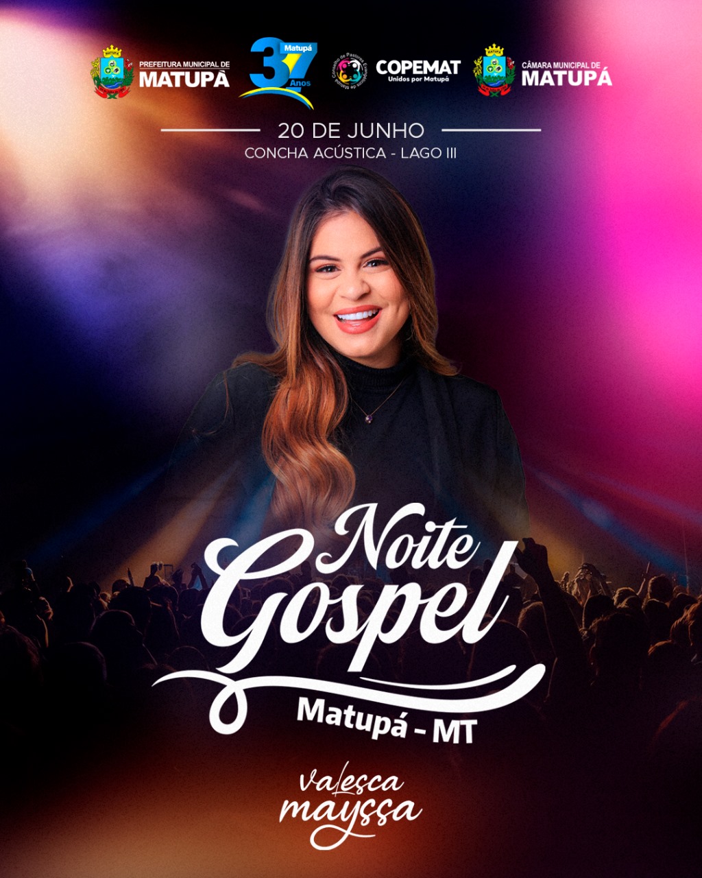 Em mais uma demonstração de compromisso com a diversidade e a fé do povo matupaense, a Prefeitura e a Câmara Municipal de Matupá organizam uma Noite Gospel especial para celebrar os 37 anos do município. O evento, que acontece no dia 20 de junho, reunirá fiéis na Concha Acústica - Lago III, proporcionando uma experiência única de louvor e adoração. Com apresentações inspiradoras, incluindo a participação de Valesca Mayssa, a noite promete emocionar a todos.