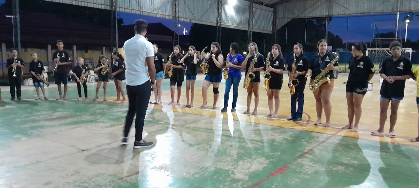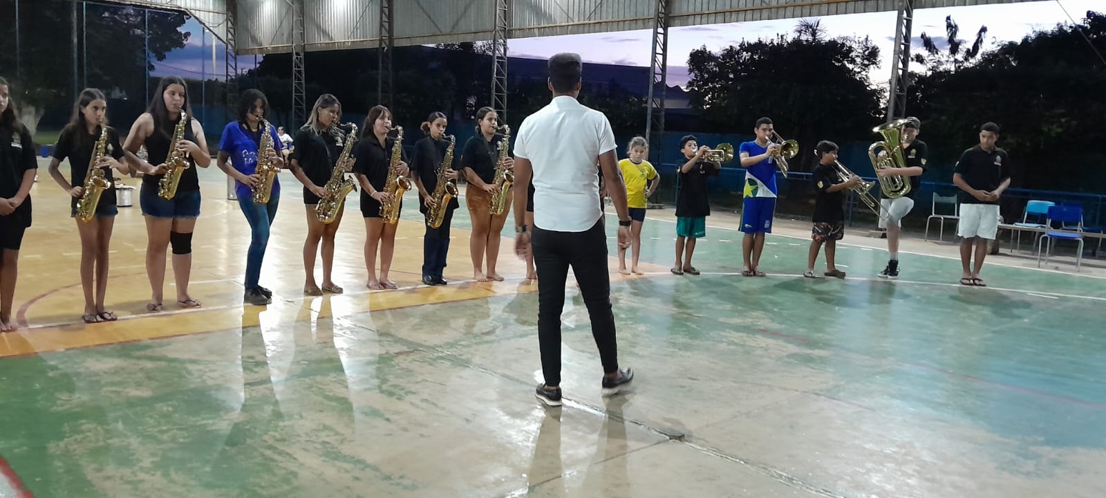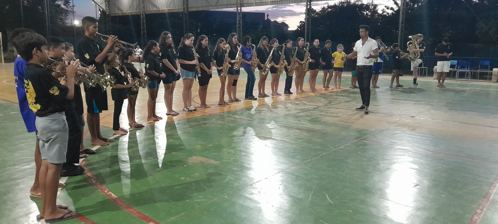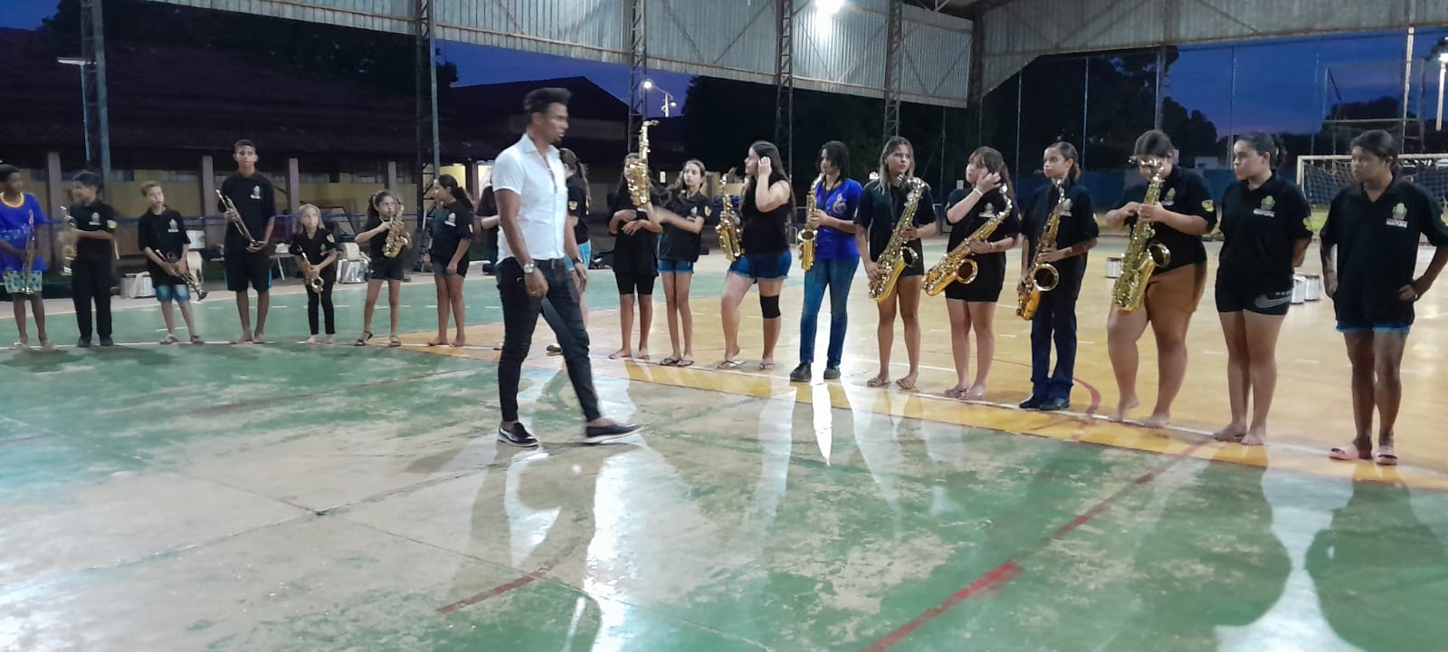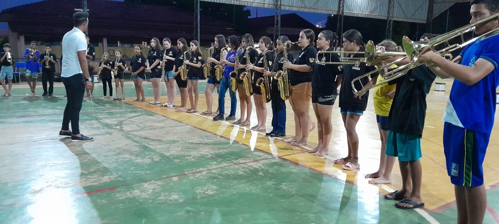 Tocando os instrumentos, bombo, caixa de Repique, flautas, pratos, sax, tanto no batuque quanto no sopro, cada aluno aspirante a músico-instrumentista vem dando um show de talento e traços de dedicação.